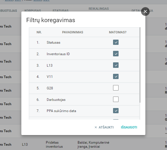 - Korpusas - norint matyti konkrečiam korpusui išduotą inventorių;