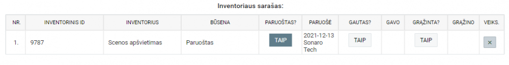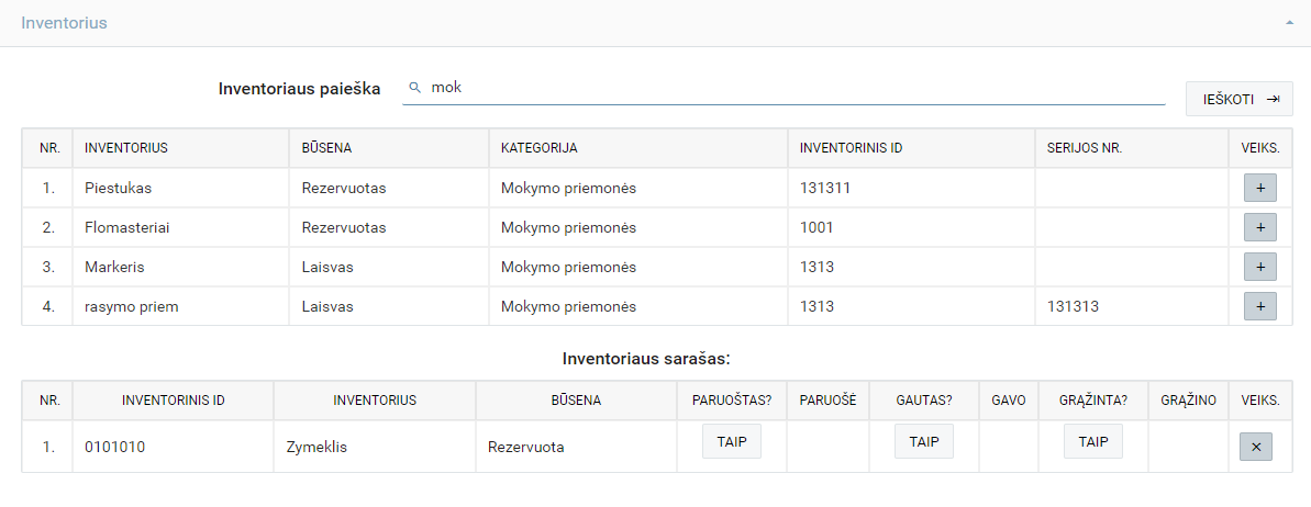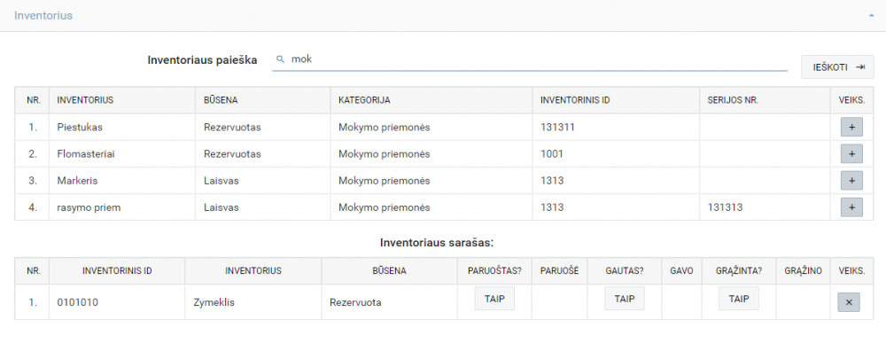 paspaudimo rezervuotas inventorius atsiranda apatinėje Inventoriaus sąrašas lentelėje (spausti mygtukus TAIP gali tik asmenys, kurių vartotojo kortelėje pažymėta, jog asmuo yra Atsakingas už inventorių).