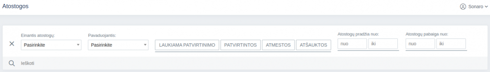 - Einantis atostogų - pasirenkamas iš sąrašo asmuo, kurio atostogų prašymus norima matyti;
