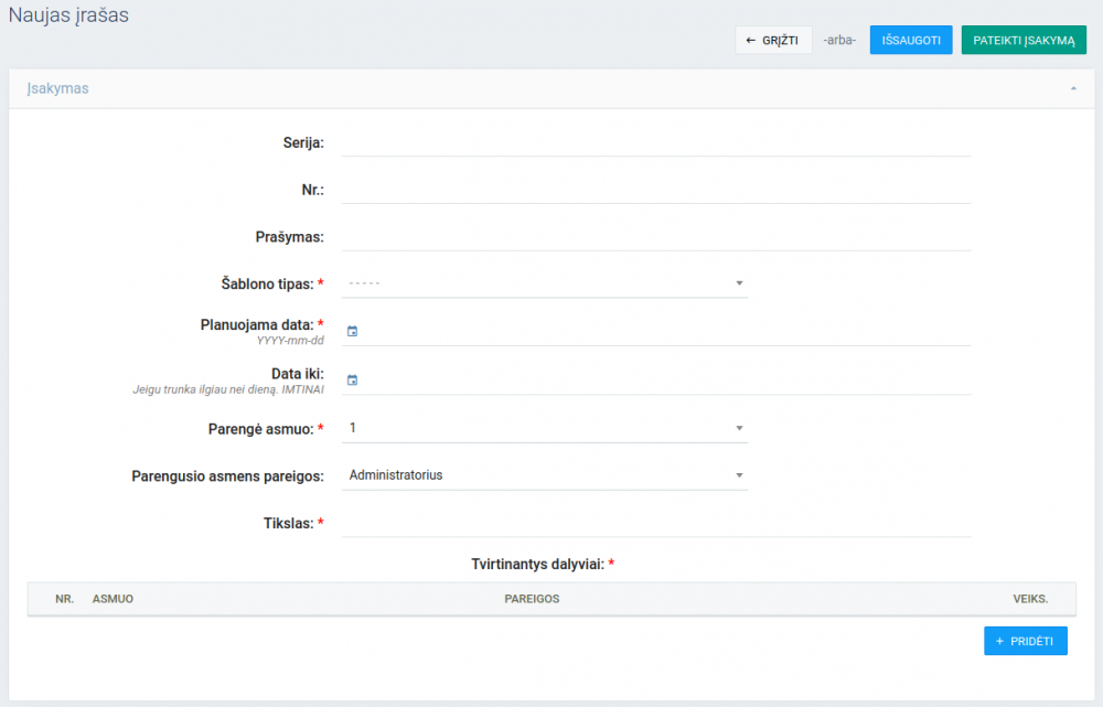 Įsakymą gali kurti atsakingi asmenys kurie turi prieigą prie Įsakymo modulio.