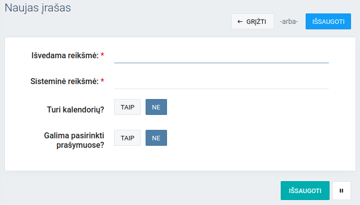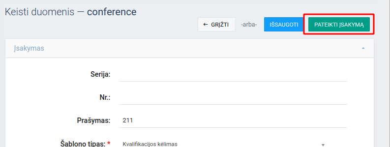 Prašymų tipo įrašas kuriamas paspaudus ![]()
