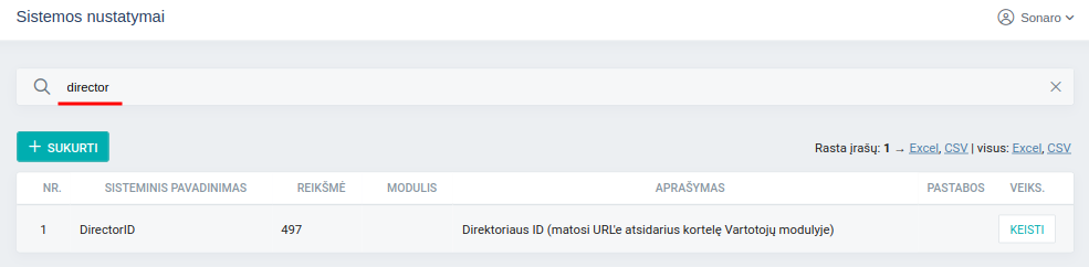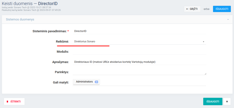 Sistemos direktorius (administratorius) nusistato modulyje Sistemos nustatymai į paiešką įrašius sisteminį pavadinimą DirectorID:![]()