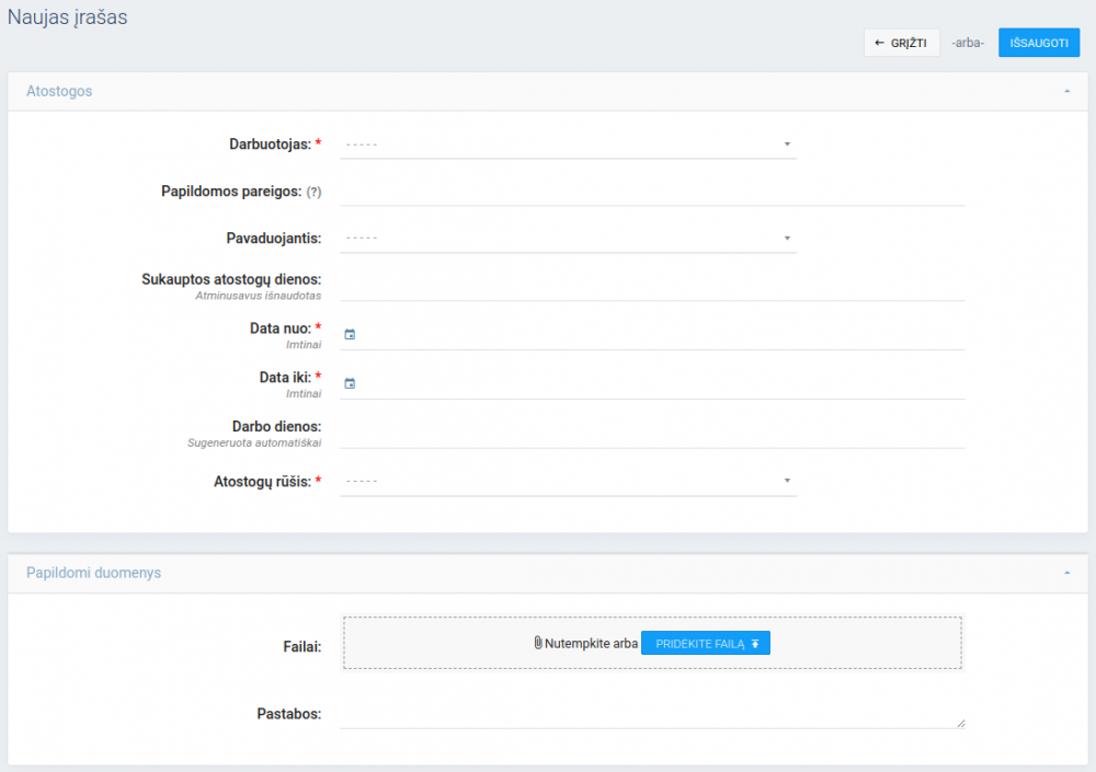 Sukauptos atostogos bei darbo dienų skaičius skaičiuojamos automatiškai.