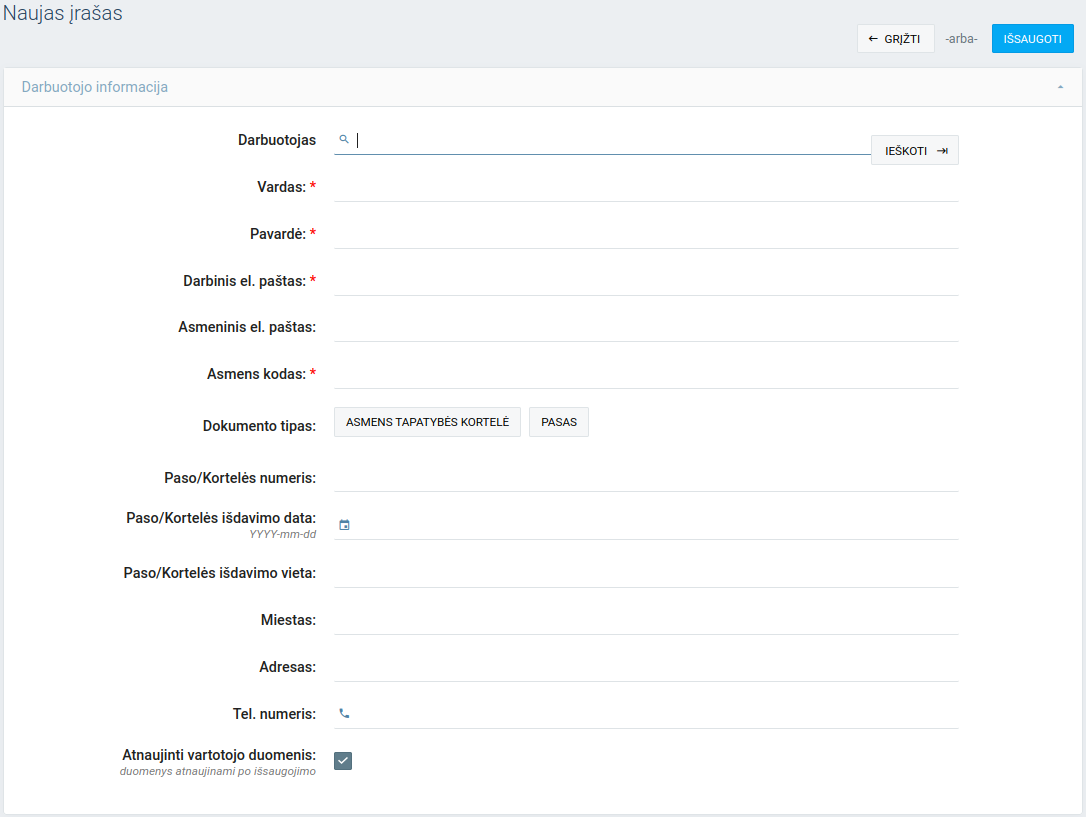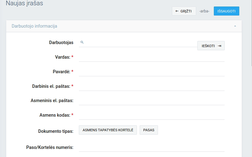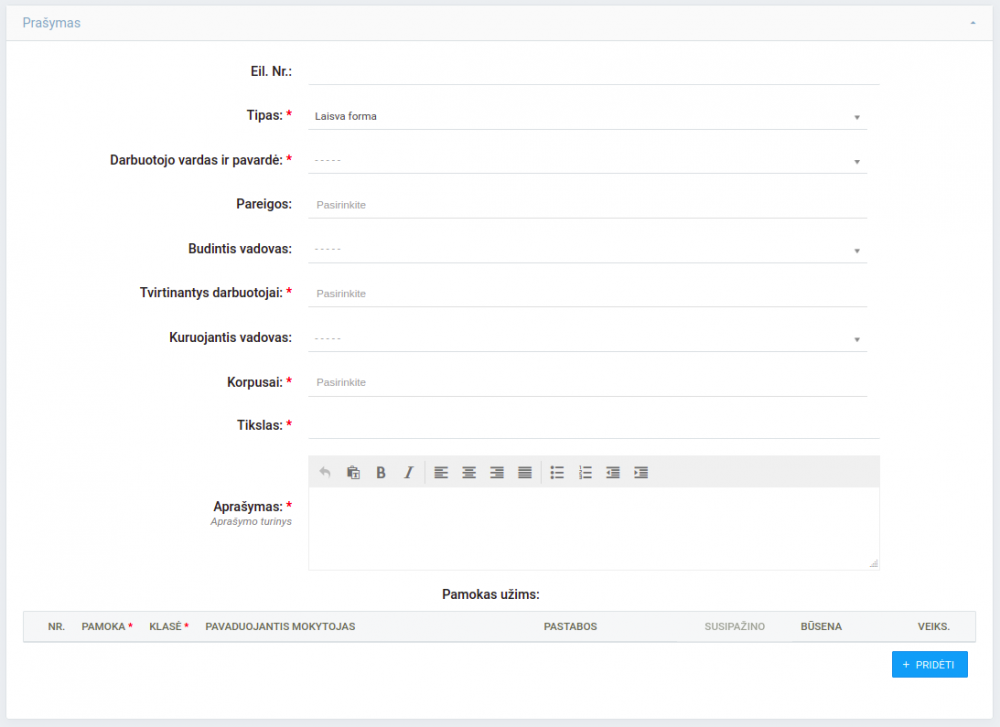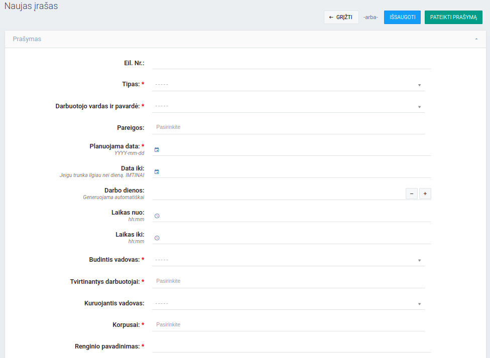 Prašymą gali kurti pats darbuotojas arba atsakingas asmuo.