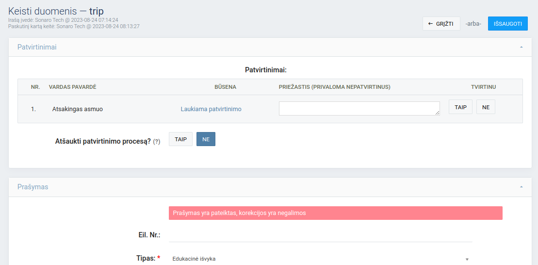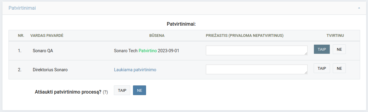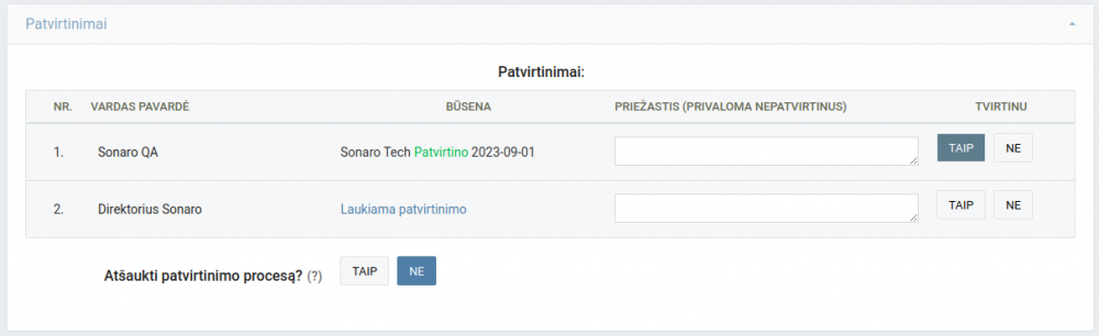 . Pradėjus tvirtinimo procesui, prašymo įraše atsiras papildoma skiltis 'Patvirtinimai':![]()