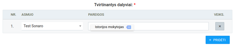 Tvirtinantys dalyviai lentelė yra naudojama įtraukti asmenis į atitinkamą įsakymo veiklą.