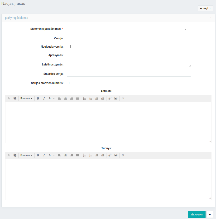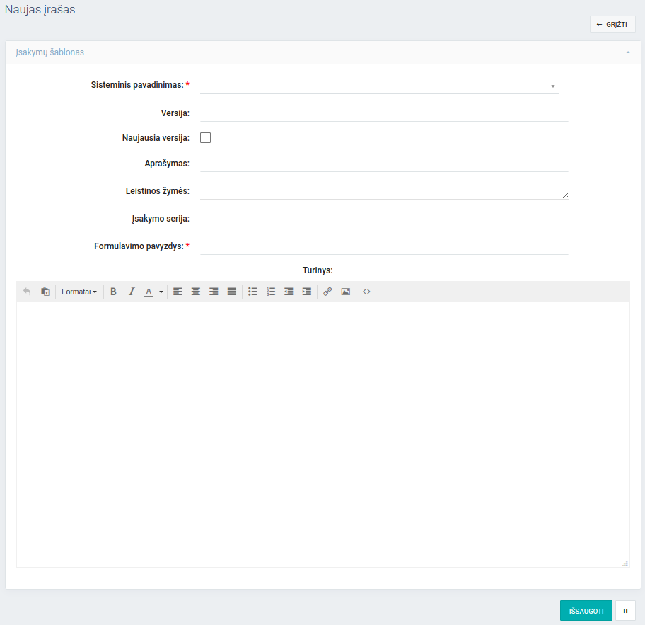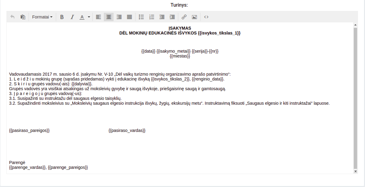 Turinys teksto lauke yra aprašomas tekstas, kuris bus naudojamas kaip šablonas įsakymams.