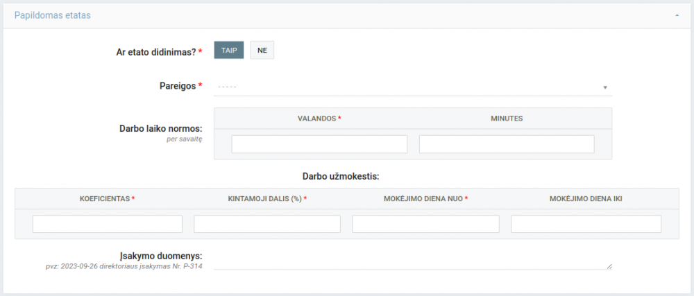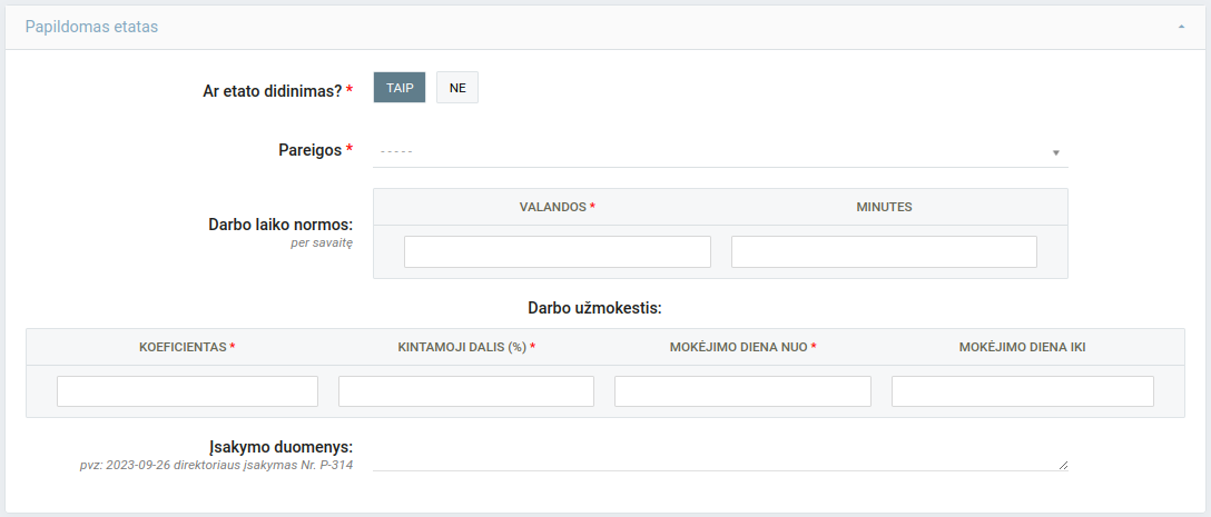 Didinant ar mažinant etato dydį, etato dydis personalo kortelėje lauke 'Etato dydis' atitinkamai pasikeičia.