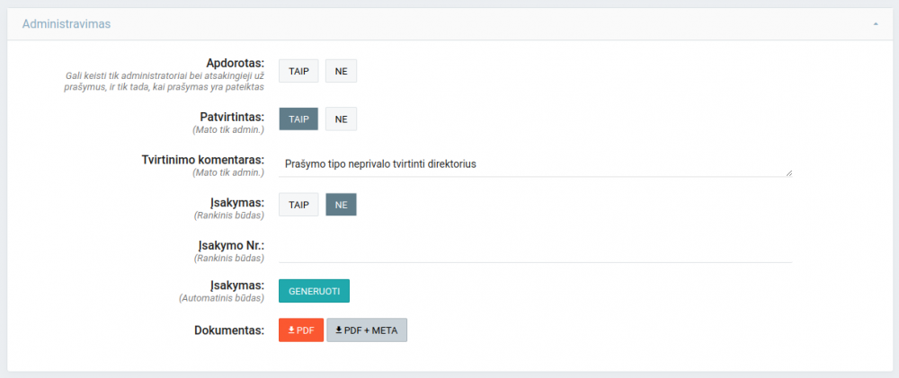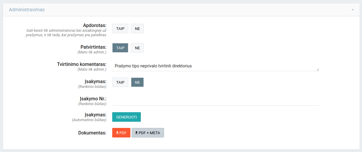 Norint peržiūrėti ar parsisiųsti ruošiamą dokumentą galima atitinkamai pasinaudoti PDF / PDF + META mygtukais. Įsakymo formą prieš tai turi būti išsaugota.