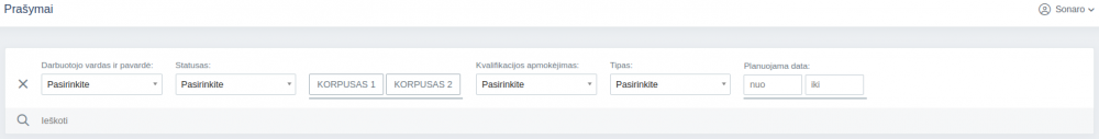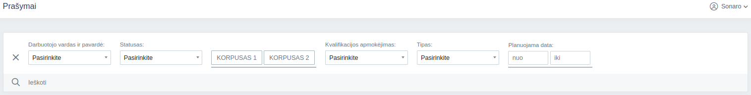 Prašymus galima filtruoti naudojantis filtru ar naudojant Paieškos laukelį.