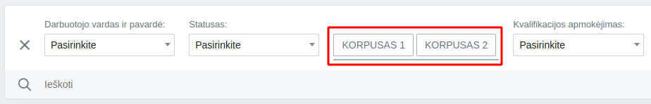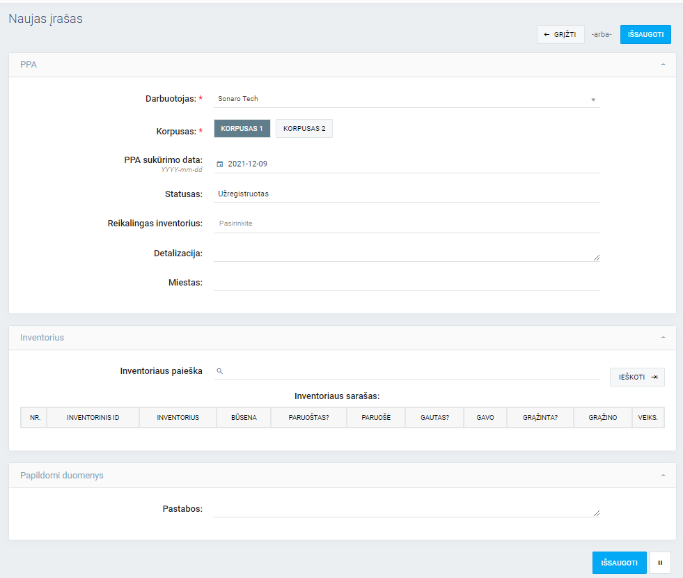 - Korpusas - korpusas parenkamas automatiškai pasirinkus darbuotoją (korpusas parenkamas tas, kuriame darbuotojas užregistruotas - jo keisti negalima. Jei Personalas modulyje asmuo priskirtas prie daugiau nei vieno korpuso, kuriant Inventoriaus išdavimo kortelę pasirinkti Korpusą yra privaloma ir pasirenkamas tas korpusas, kuriam inventorius turi būti išduodamas);