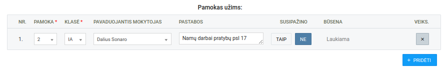 Pamokas užims lentelėje yra pildoma duomenimis kas pavaduos asmenį, pildantį Prašymą: