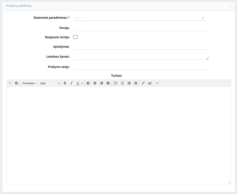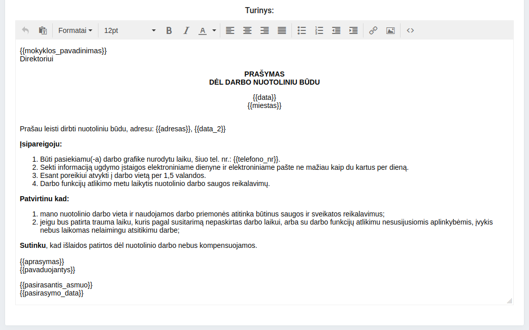 Turinys teksto lauke yra aprašomas tekstas, kuris bus naudojamas kaip šablonas prašymams.