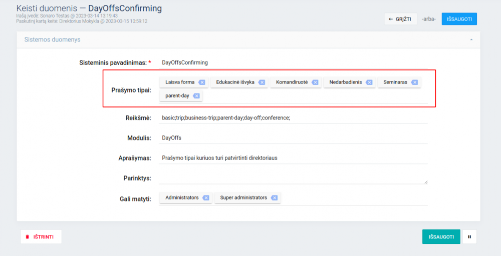 Prašymai, kurie turi būti patvirtinti ir direktoriaus yra nustatomi pagal prašymų tipus Sistemos nustatymai modulyje: