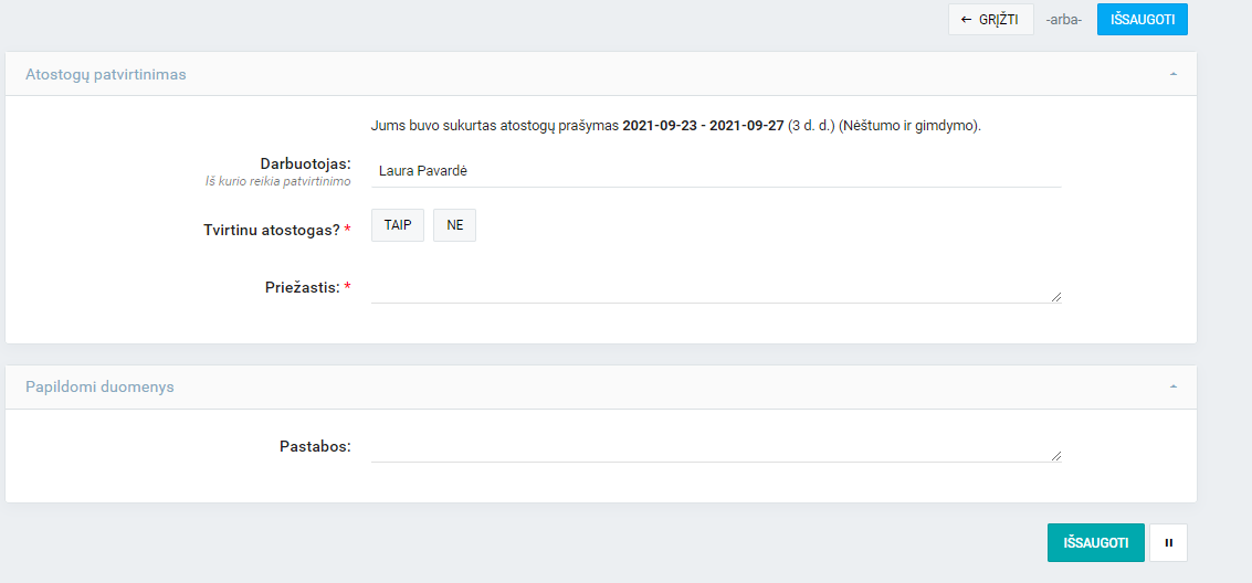 - Priežastis - priežastį būtina užpildyti, jei atostogų prašymas buvo atmestas, tačiau neprivaloma, jei atostogų prašymas buvo patvirtintas;