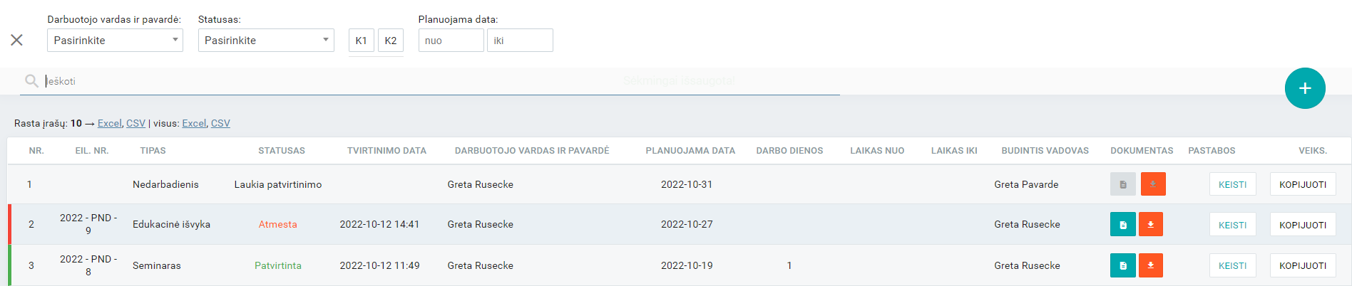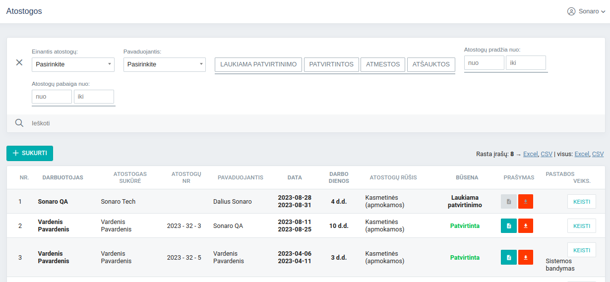 Atostogų modulyje matomi visi užpildyti atostogų prašymai: