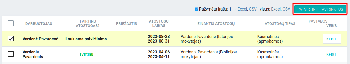 . Taip yra patvirtinami visi pažymėti atostogų prašymai.