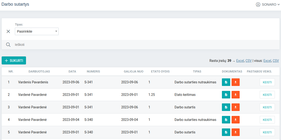 Darbo sutartis galima filtruoti naudojantis filtru ar naudojant Paieškos laukelį.