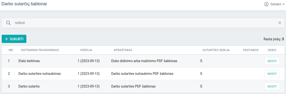 Darbo sutarčių šablonai modulyje yra matomi bei kuriami sutarčių šablonai, kurie naudojami formuojant sutartis Darbo sutarčių modulyje.