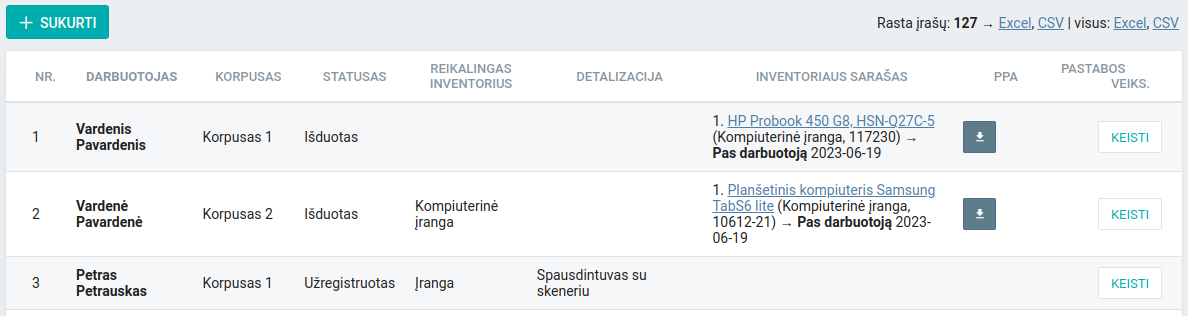 - Darbuotojas - norint matyti išduotą inventorių konkrečiam asmeniui;