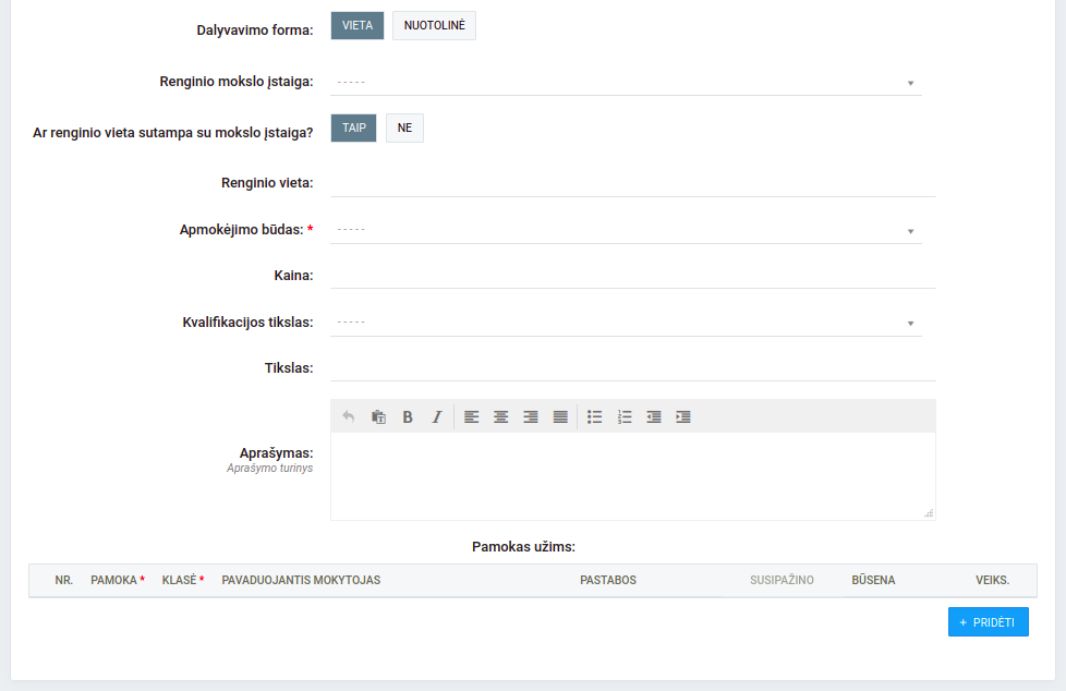 - Reikalingas inventorius - spustelėjus automatiškai atsiranda sąrašas įvesto inventoriaus, pvz.: Baldai, Mokymo priemonės (galima rinktis daugiau nei vieną);