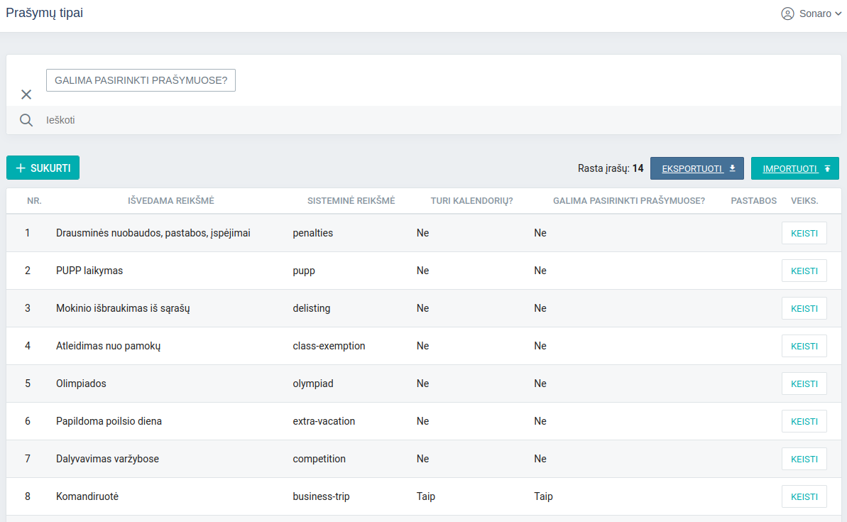 - Galima pasirinkti prašymuose? - mygtukai atitinkamai atfiltruoja visus tipus, kuriuos galima pasirinkti prašymuose.